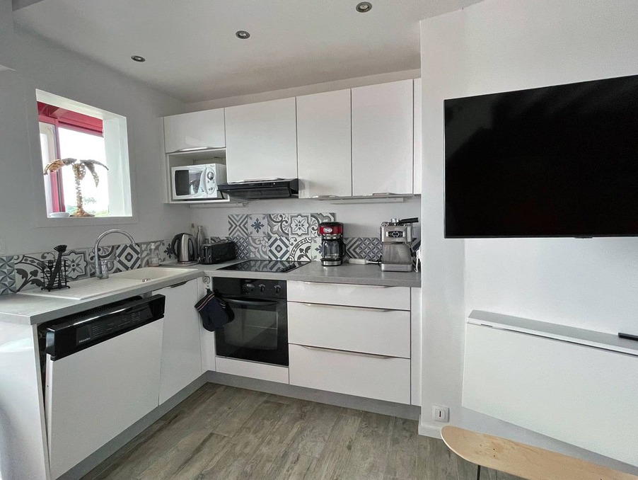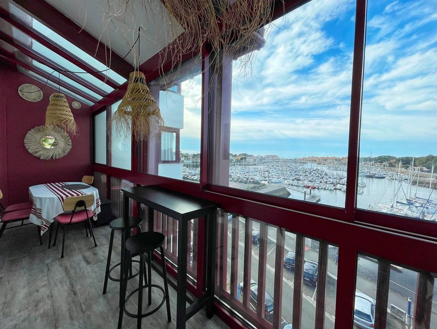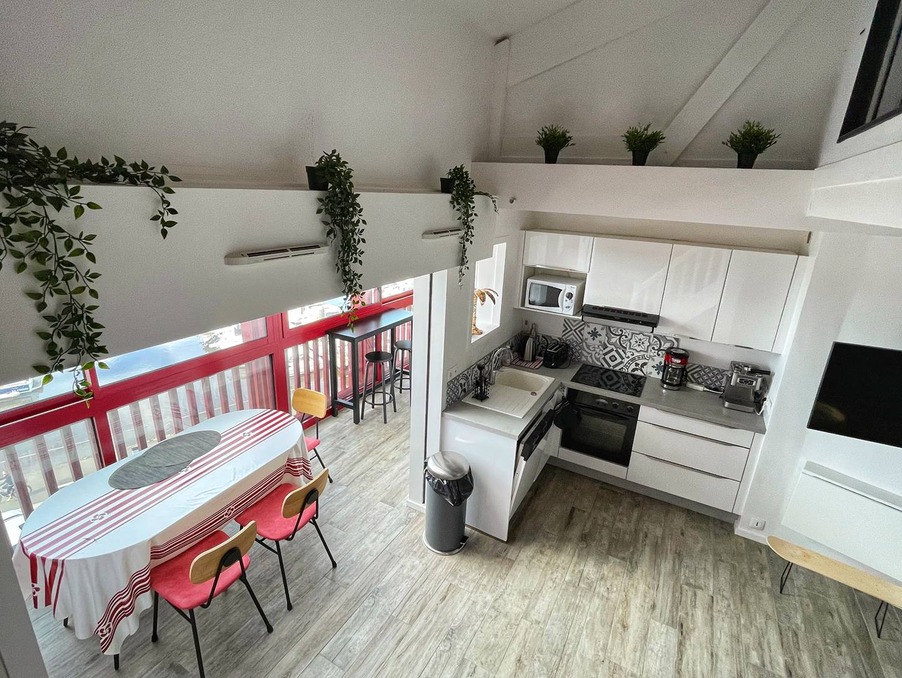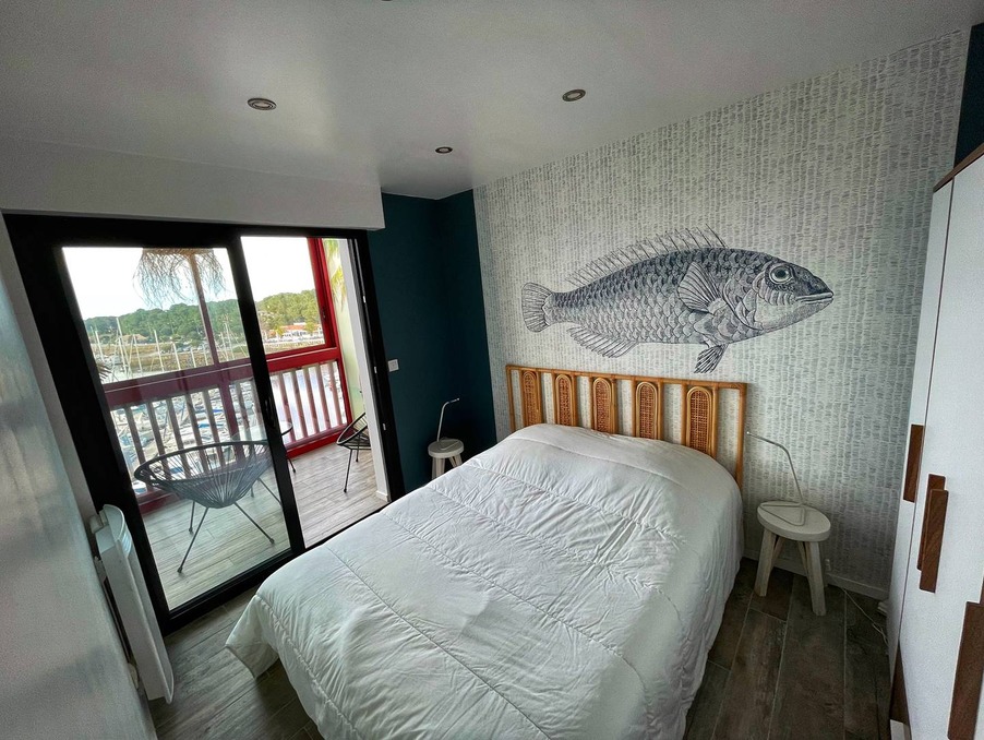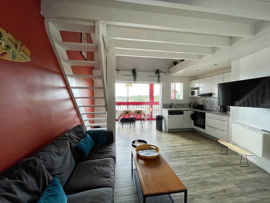 La loggia est aménagée d'un mange debout pour prendre vos petits déjeuner avec une vue plongeante sur le port, d'une table pour partager vos repas et d'un coin lecture. La cuisine est ouverte sur le salon. L'équipement de l'appartement est moderne, complet et fonctionnel (lave-linge, lave-vaisselle, télévision, four, micro-ondes). La fibre et une place de parking souterraine sont comprises dans la location. Côté nuit, au rez de chaussée, une chambre est équipée d'un lit double, de placards et d'une salle d'eau attenante. Des WC séparés sont également disponibles. A l'étage vous trouverez: un BZ sur la mezzanine et une seconde chambre avec un lit double et un coin salle d'eau. Coup de coeur assuré !
