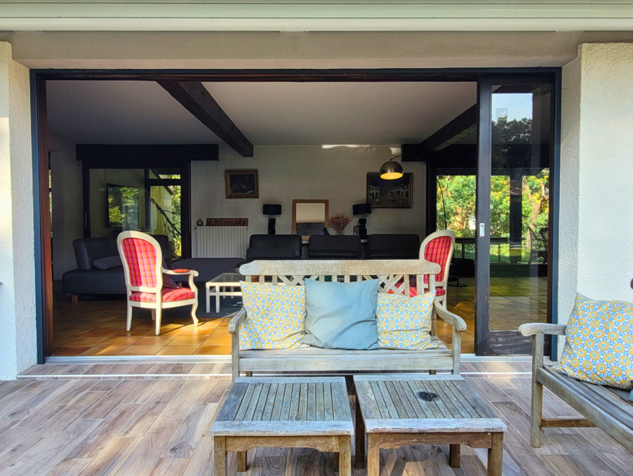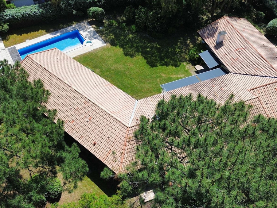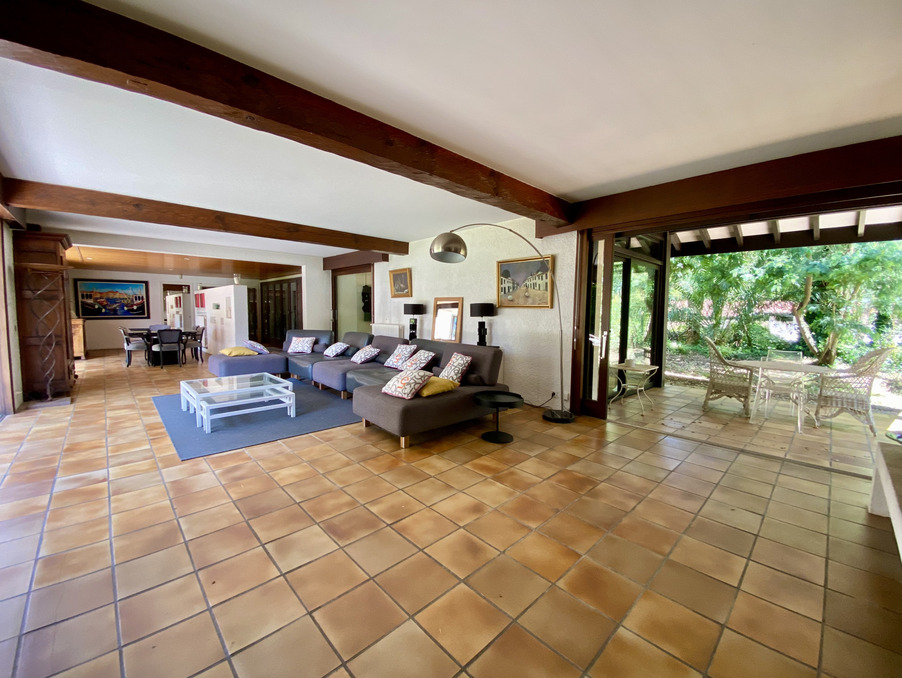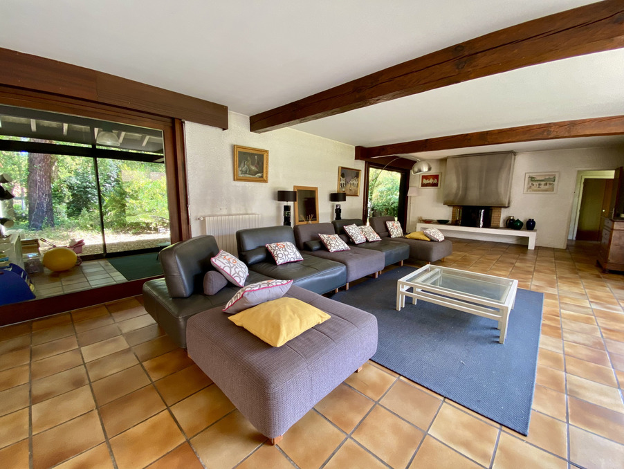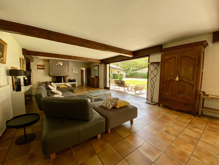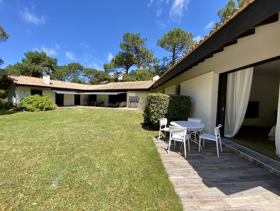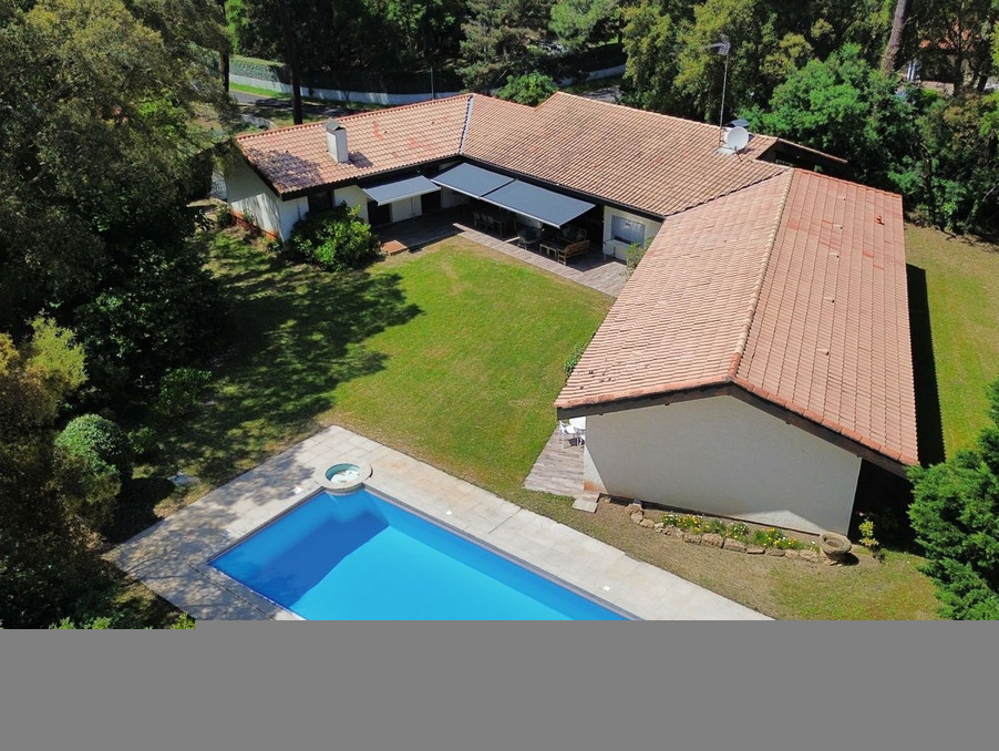 Villa d'architecte de plain-pied à vendre à Hossegor entre lac et mer. Découvrez cette villa d'architecte de plain-pied, signée par un architecte réputé des années 1980, situés dans un secteur privilégié à 100m du lac et moins de 500m de la plage de la Gravière. Offrant un calme absolu et un environnement remarquable, cette propriété se distingue par ses grands volumes, sa construction solide et son parc dominant sans vis-à-vis. Batie au début des années 80, d'une surface de 250 m2 habitable sur un terrain plat légèrement dominant de 2550 m2, elle offre des volumes généreux autour d'un vaste séjour lumineux avec des hauteurs sous plafond. Exposée au sud, ses grandes baies vitrées ouvrent sur un parc fleuri. L'extérieur est paysagé dans un cadre naturel sans vis-à-vis. La villa offre un grand potentiel d'aménagement avec des possibilités d'extension ou de rénovation. Construite avec des matériaux de qualité, cette villa offre une architecture intemporelle et des espaces ouverts vers la nature. Idéale tant en residence principale que secondaire, elle garantit une qualité de vie exceptionnelle à proximité immédiate des plages, du lac marin, des golfs et de toutes les commodités.