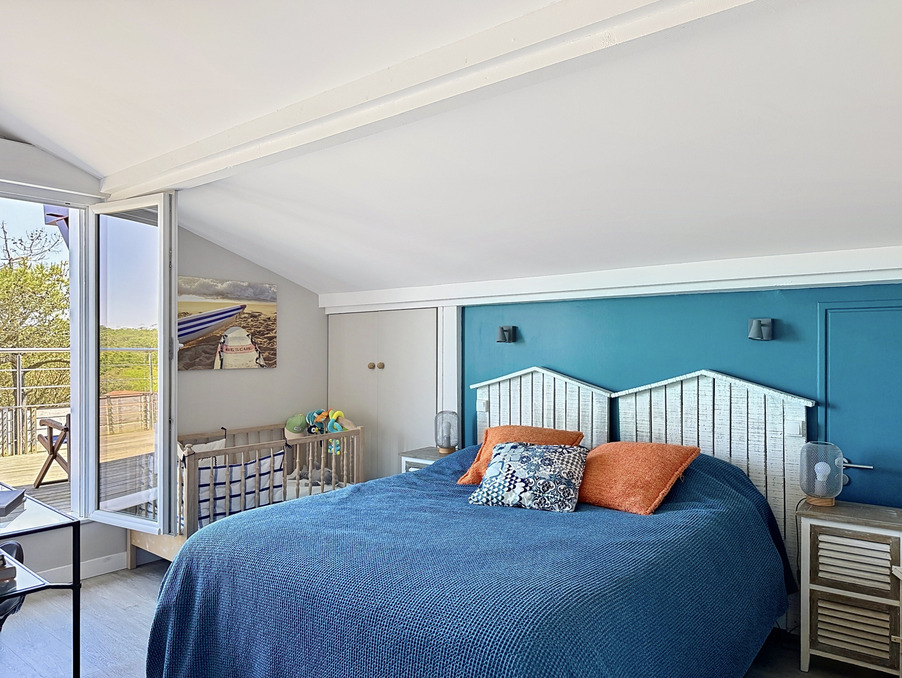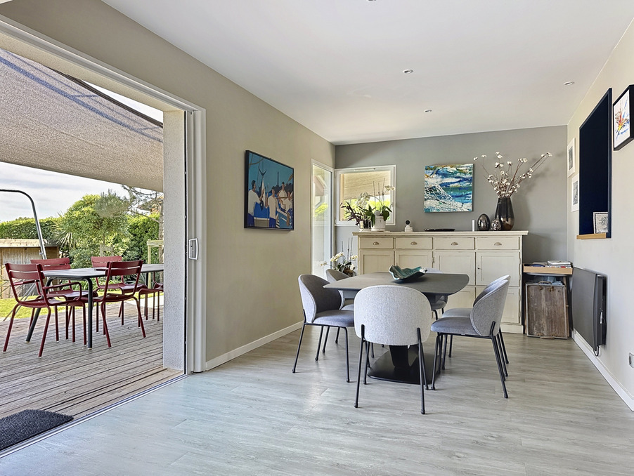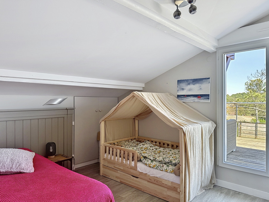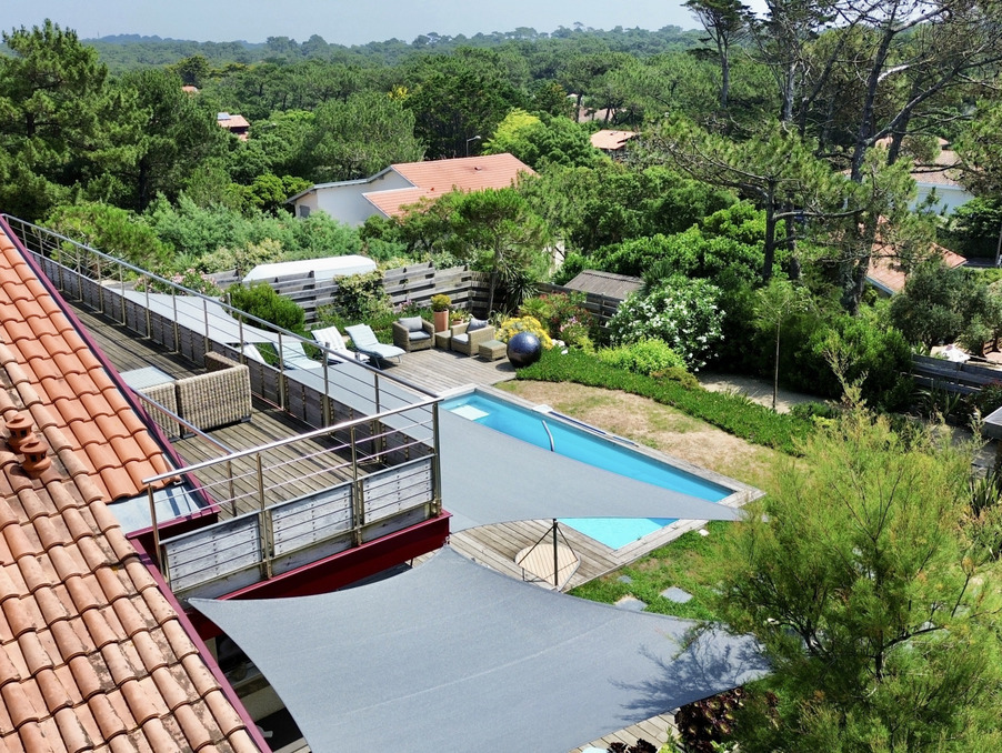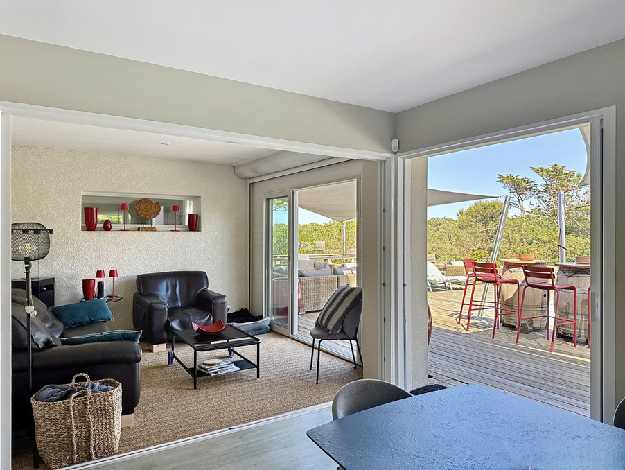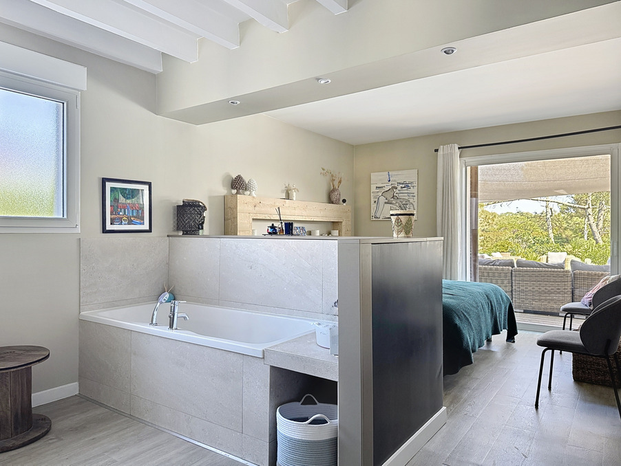 Cette propriété rare, construite dans l'esprit « Beach House », nichée dans un écrin de verdure, conjugue l'élégance décontractée d'une maison de plage avec le raffinement d'une maison de famille. Cette villa, pensée pour durer, a su évoluer au fil des années pour accueillir plusieurs générations dans un confort absolu. Lumineuse et ouverte sur l'extérieur, la villa déploie ses espaces de vie autour d'un salon chaleureux avec un poêle à granulés, d'une salle à manger conviviale, d'un espace détente baigné de lumière et de grandes ouvertures qui prolongent la vie à l'extérieur. Chaque recoin a été imaginé pour célébrer l'art de vivre en bord de mer La cuisine semi-ouverte est fonctionnelle et conviviale. Côté nuit, une suite parentale complète (chambre, salle de bain, dressing et bureau) assure indépendance et intimité. Un espace cinéma, facilement transformable en chambre supplémentaire selon vos besoins, complète ce niveau, ainsi qu'une buanderie avec douche (idéale au retour de la plage) et une salle d'eau. À l'étage, vous trouverez trois chambres, dont deux ouvertes sur une vaste terrasse en bois avec vue spectaculaire sur la pinède. Une quatrième pièce, aujourd'hui dédiée à la musique et au bureau, offre une vue imprenable sur l'océan au sud.