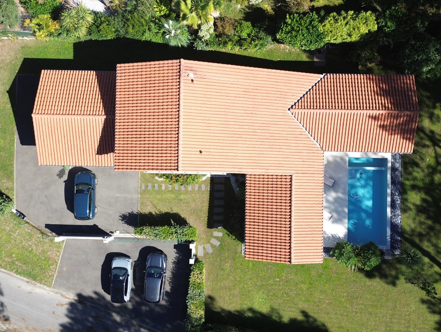 La maison séduit par ses volumes confortables et son agencement fonctionnel. Le grand séjour, baigné de lumière et ouvert sur la terrasse ainsi que sur la piscine, s'accompagne d'une cuisine équipée avec arrière-cuisine. Le rez-de-chaussée comprend également un dressing d'entrée, une buanderie et un vaste bureau, offrant un confort de vie optimal au quotidien.