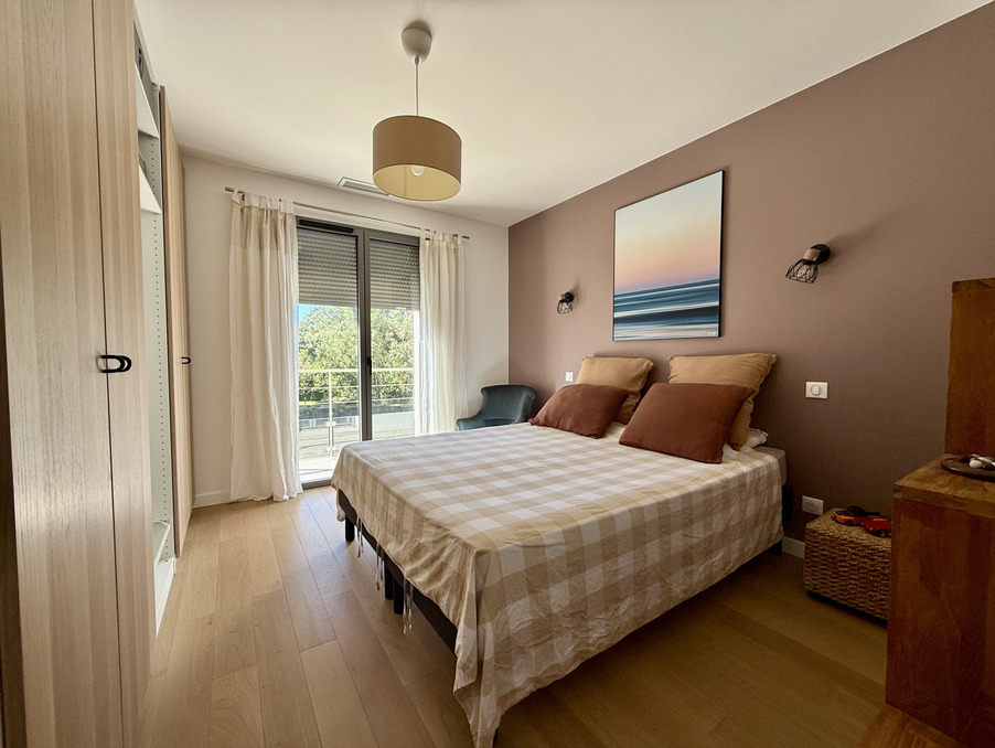 Côté nuit, la villa dispose de quatre chambres : une suite parentale en rez-de-chaussée avec dressing et salle de bains, une seconde suite à l'étage, ainsi que deux autres chambres partageant une salle de douche.