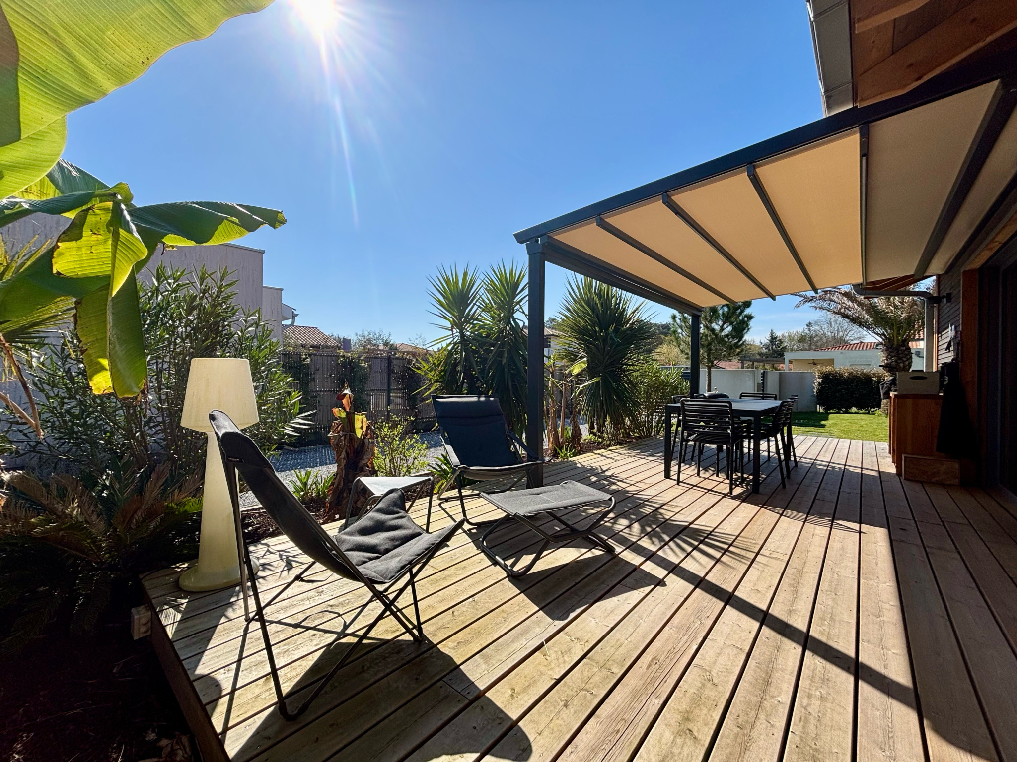 De plain pied, elle vous accueuille dans son séjour cathédrale très clair, son espace nuit avec ses trois belles chambres avecd rangements, sa salle d'eau, son garage, sa terrasse avec pergola bioclimatique, son jardin agrémenté, clos avec portail automatique.