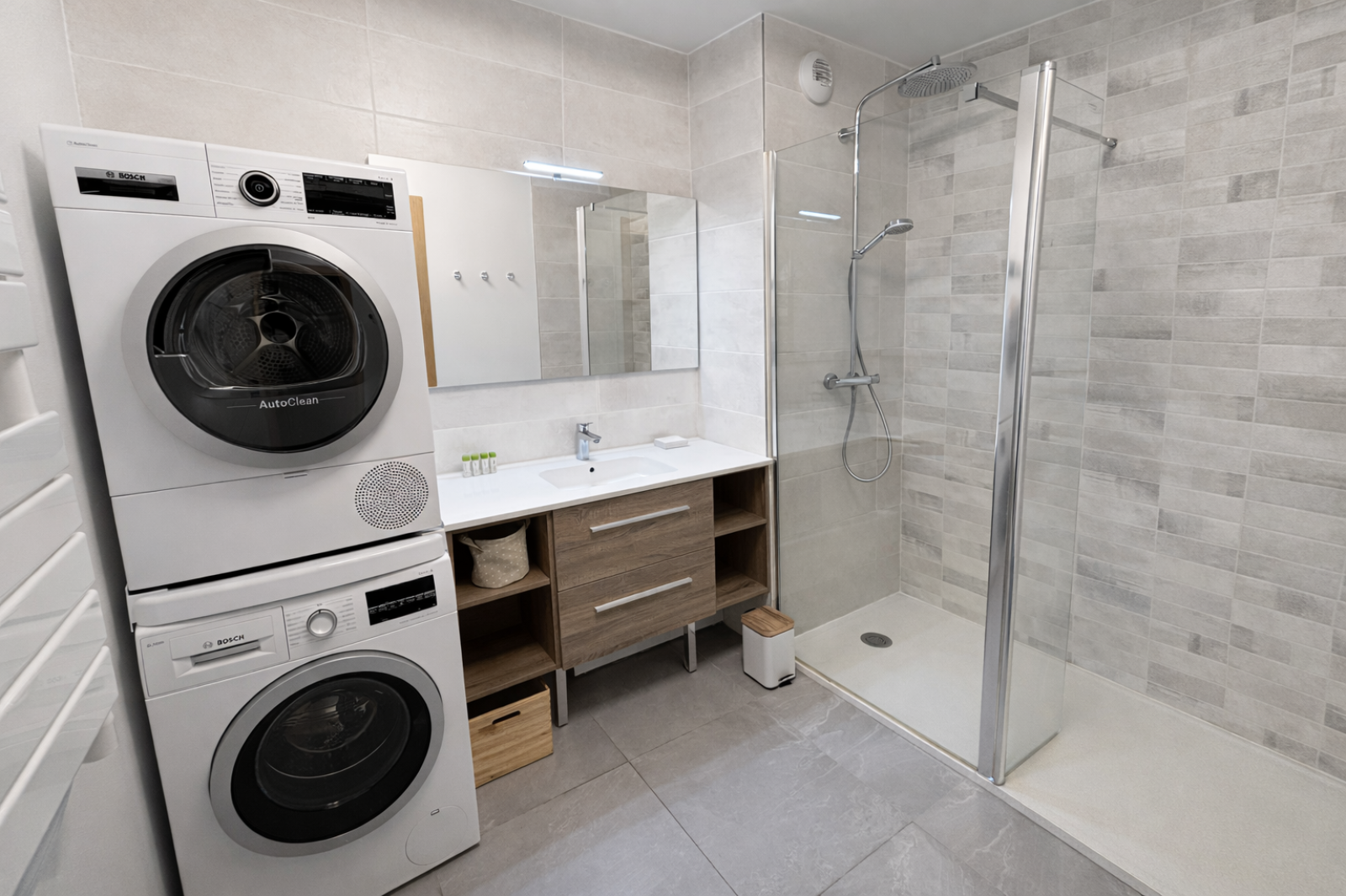 Une salle d’eau moderne avec douche à l’italienne ainsi que des WC séparés complètent l’ensemble.