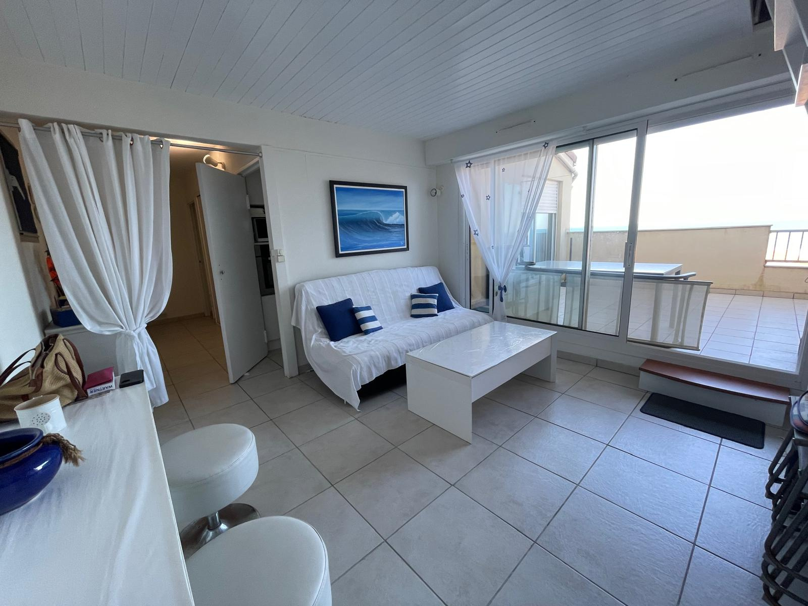 Situation très recherchée pour ce spacieux et confortable appartement en bordure d'océan, doté d'une vaste terrasse ensoleillée avec vue exceptionnelle, permettant de recevoir ou de prolonger les bains de soleil après les baignades, séjour-salon, cuisine indépendante, chambre et mezzanine, cave et parking sécurisé. A voir absolument !